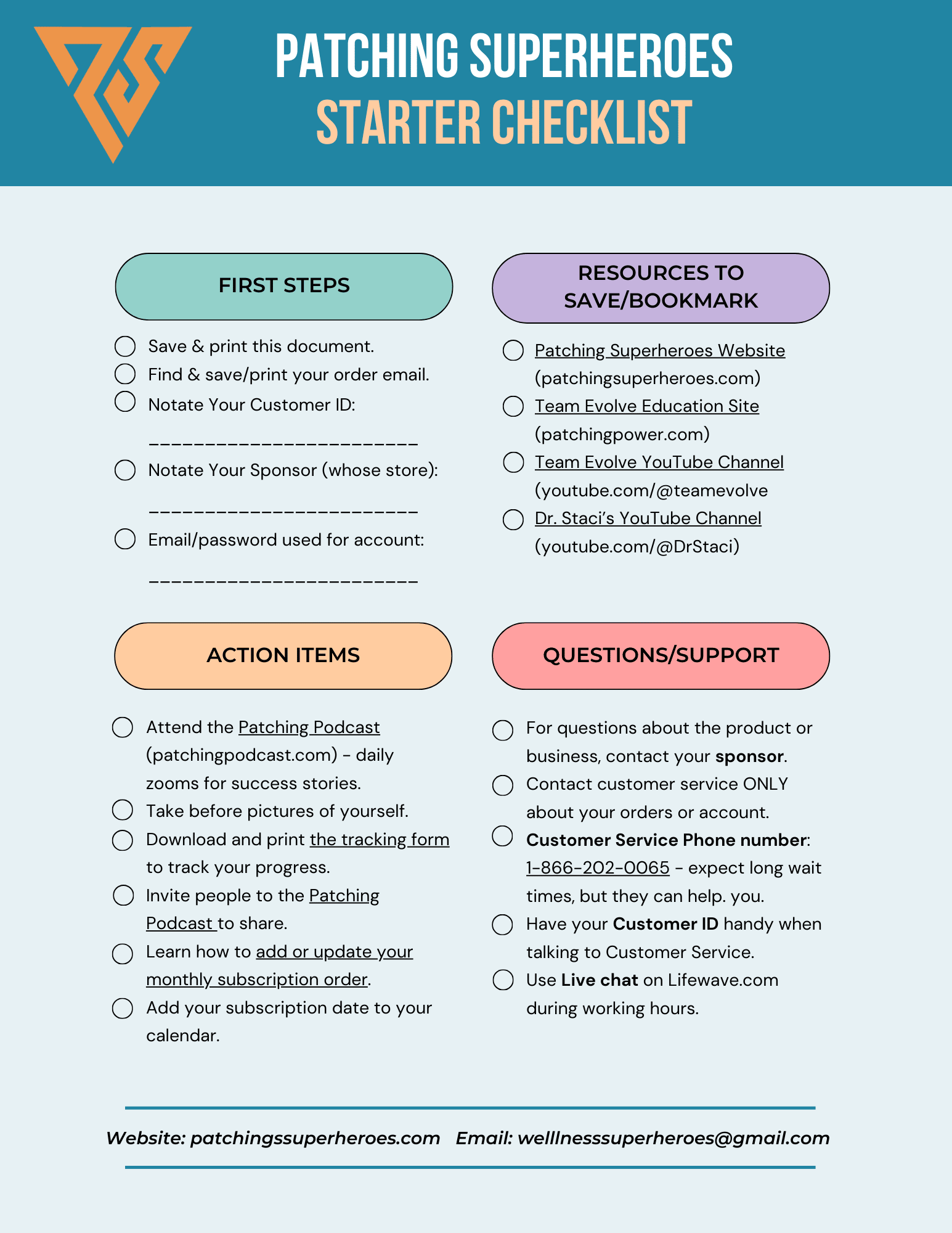 These checklists includes everything you need to start off strong in using the patches and in being a successful Brand Partner!